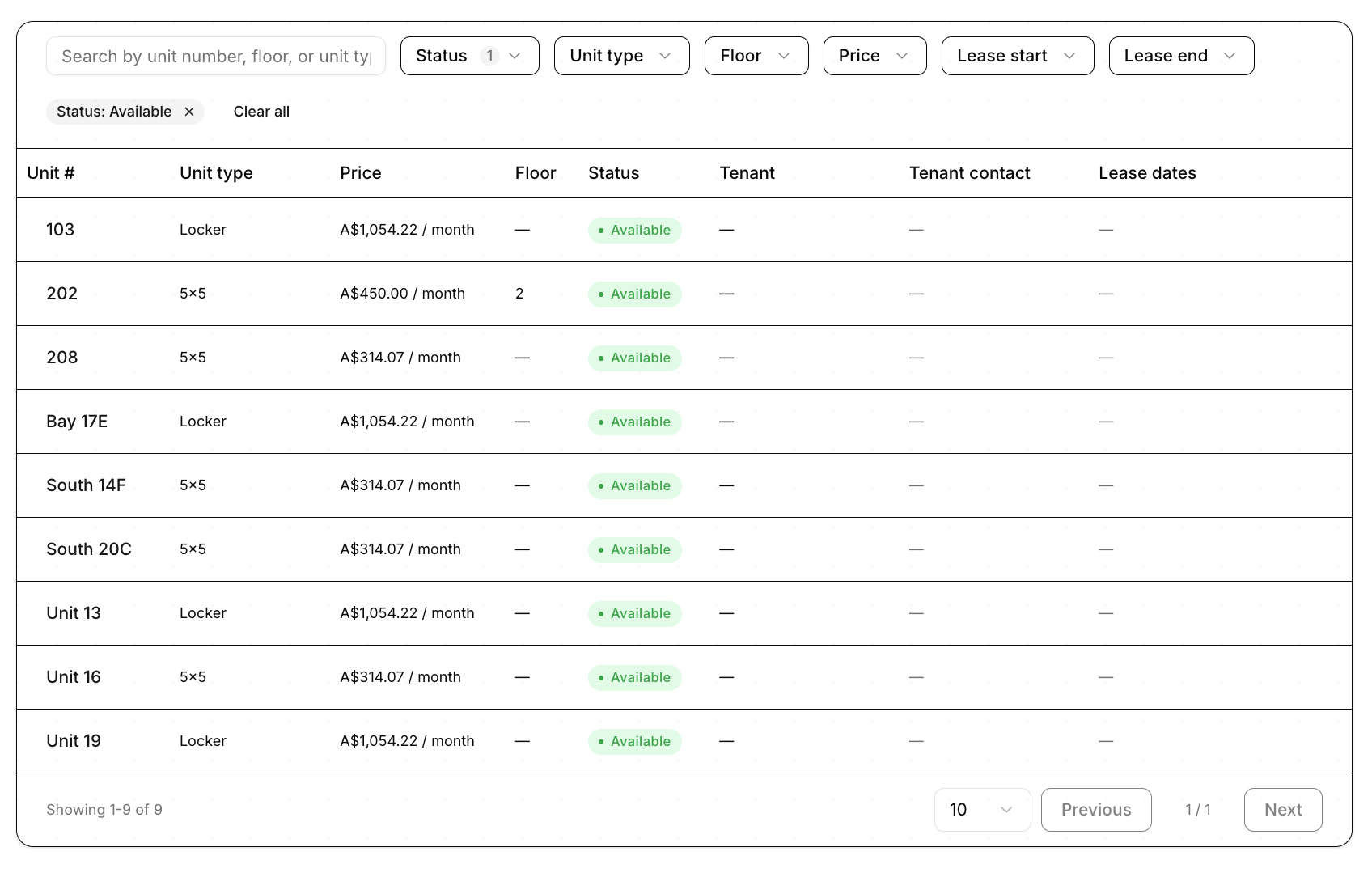 See which units are occupied, reserved, or available at a glance. Unit statuses update automatically as leases begin and end.